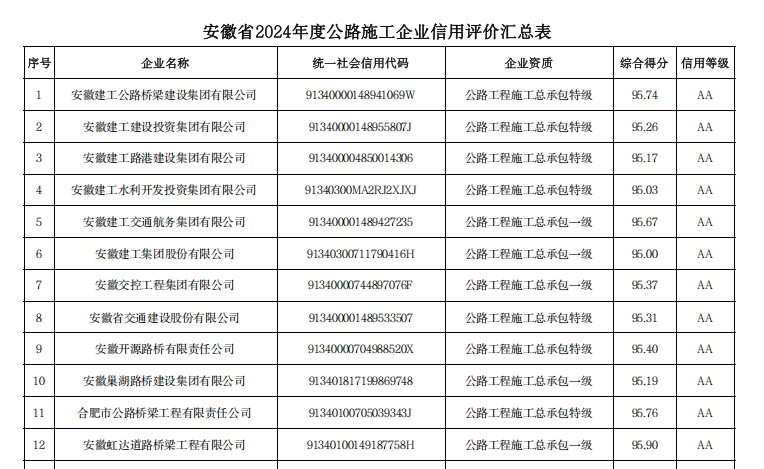 近日,安徽省交通运输厅公布2024年度全省公路水运工程信用评价结果,合肥路桥凭借在公路施工与养护施工领域的出色表现,同时斩获公路施工企业与养护施工企业信用评价双AA级荣誉。