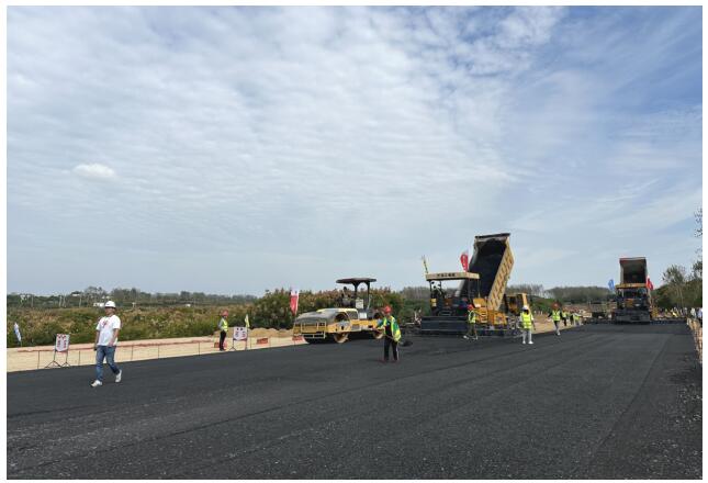 据了解,此次摊铺的主线路面底基层水泥试验段长200m,宽16.48m。为确保摊铺工作的顺利进行,项目施工方提前组织谋划,优化资源配置,严格控制水泥稳定碎石混合料的拌合、运输、摊铺、碾压、检测等各个环节,铺筑过程中各类机械设备紧密配合,现场管理人员对松铺系数、碾压遍数、摊铺厚度进行严格控制并全过程检查记录,施工现场井然有序,摊铺过程进展顺利。