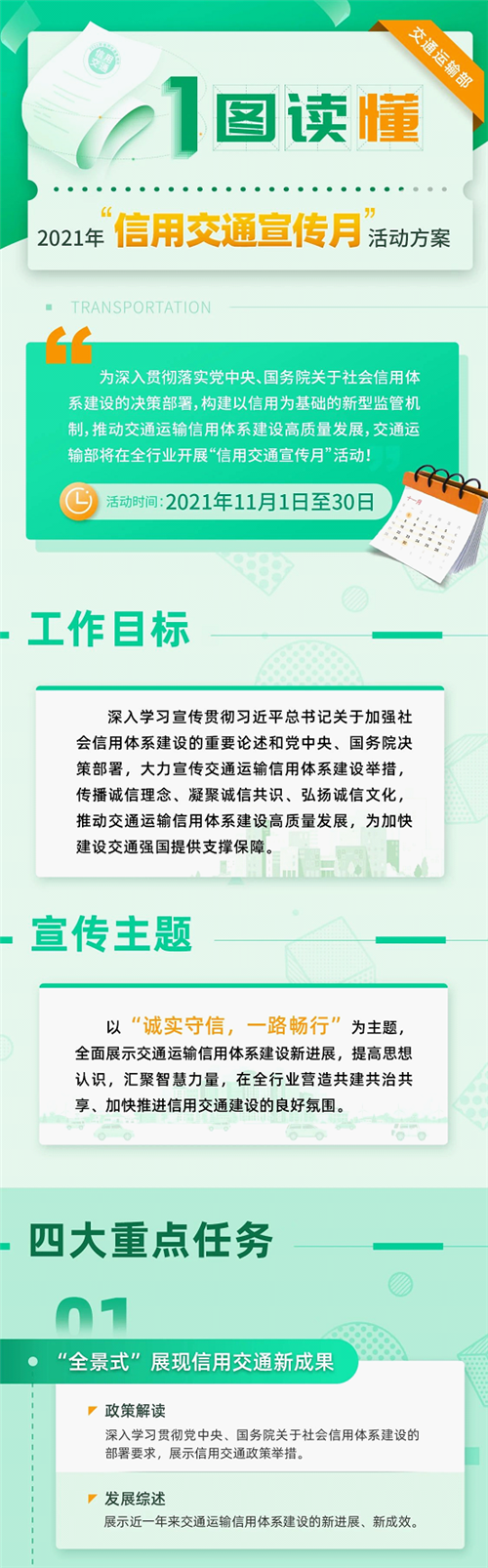 根据交通运输部部署, 2021年“信用交通宣传月”活动已经正式启动。本次活动以“诚实守信,一路畅行”为主题,采取全方位、多角度、融媒体形式,全面展示交通运输信用体系建设新进展新成效,深入报道我市交通运输部门在重点领域信用专项治理、数字信用、信用监管、“信用+”工程建设等方面的创新经验做法,努力在全行业营造诚实守信良好氛围。