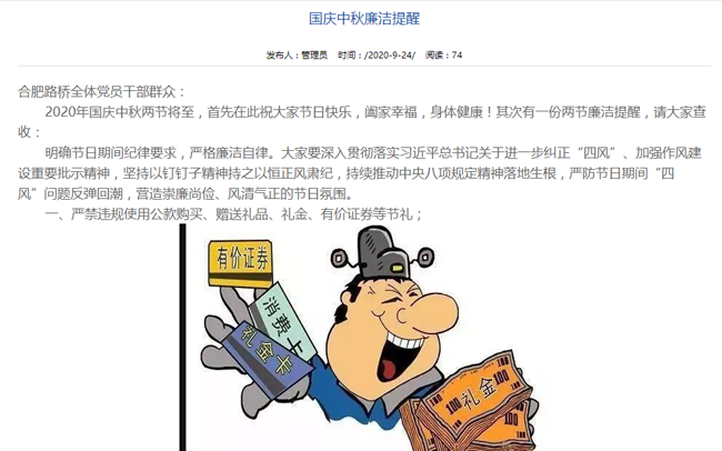 “2020年国庆中秋两节将至,首先在此祝大家节日快乐,阖家幸福,身体健康!其次有一份两节廉洁提醒,请大家查收。”