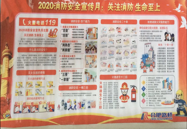2020年11月9日是全国第二十九个消防宣传日,本次消防宣传日主题为:“关注消防,生命至上”。为保证项目安全施工,合肥路桥分公司各项目分别开展了消防宣传培训活动。