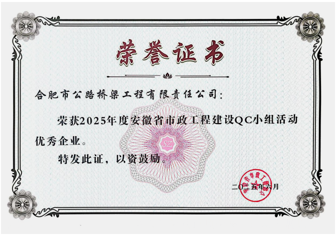 近日,安徽省暨合肥市2025年度市政工程建设优秀QC小组活动成果发布会顺利举办,合肥路桥凭借优秀组织及多项研究成果,荣获“2025年度安徽省市政工程建设QC小组活动优秀企业”称号。
