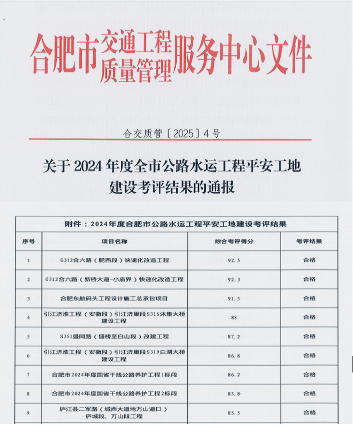 从合肥市交通工程质量管理服务中心获悉,由合肥路桥公司承建的G312合六路(肥西段)快速化改造工程、S351盛同路(盛桥至白山段)改建工程、合肥市2024年度普通国省干线公路养护工程1标项目考核达标,荣获合肥市2024年度公路水运工程“平安工地”称号。此外,公司淮桐高速施工1标荣获淮桐高速项目2024年度先进集体。