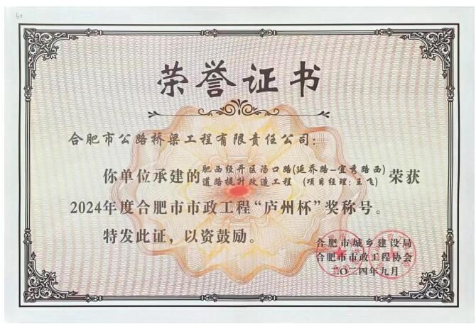 日前,合肥市市政工程协会就《2024年度合肥市市政工程“庐州杯”奖获奖项目名单》进行了公布。合肥路桥肥西经开区汤口路(延乔路-宜秀路西)道路提升改造工程荣登榜单。