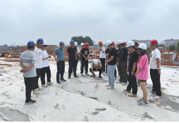 在了解该项目概况、现阶段施工部位、关键工艺、建成意义后,全体师生前往项目Y113上跨桥施工现场参观学习,为使学生们对节点施工有系统全面的认知,项目部还通过PPT详细介绍了Y113上跨桥施工过程难易程度及控制要点等内容。