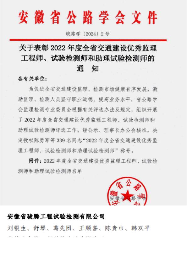 日前,从安徽省公路学会获悉,2022年度全省优秀检测师、优秀助理检测师评选结果出炉,骏腾检测刘银生、舒琴、葛先团、王顺喜、陈贵巾、韩双平等同志荣获称号。 一直以来,骏腾检测以人才建设、技术创新为动力,以专业实力为手段,以客户满意为目标,培养出一大批公路检测技术骨干力量,同时公司以科技创新为驱动力,研究新课题,申报新技术,2023年骏腾检测再获国家发明专利和实用新型专利5项、软件著作3项。 下一步,骏腾检测将继续以人才队伍建设、科技创新为抓手,紧紧围绕“质量第一、方法科学、服务满意”的宗旨,牢记初心使命,主动担当作为,奋力走好新时代安徽公路检测人的新长征路。(舒琴)