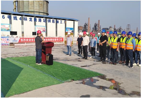 在龙岗路站建设现场,观摩人员听取了有关项目工程概况、施工工艺、盘扣架搭设参数及过程管控等情况介绍,实地参观了项目主体结构第四仓段(9-11轴)负一层顶板主体模板支架,详细了解了盘扣支架搭设工艺流程。