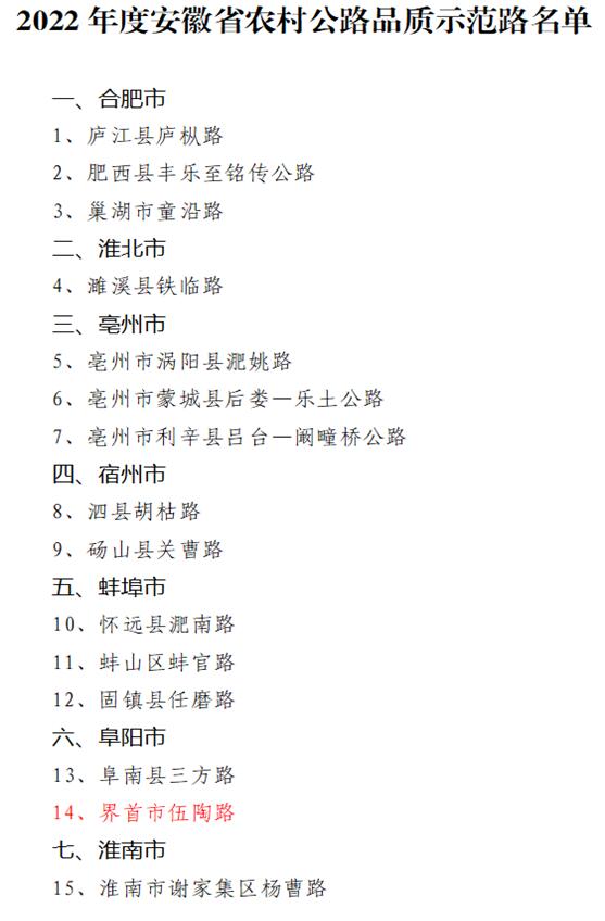 近日,2022年度安徽省农村公路品质示范路名单正式公布,由合肥路桥承建的2021年界首市陶司路及自然村通硬化路和联网路工程中的陶司路(原名伍陶路)榜上有名。