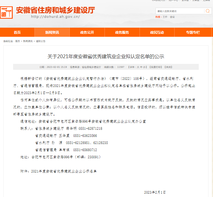据悉,2021年度安徽省优秀建筑业企业评选是安徽省住房和城乡建设厅、安徽省交通运输厅、安徽省水利厅联合开展的第二届认定评选活动。评选标准分别从社会责任履行、企业经营发展、企业管理创新、企业建造能力、企业文化建设等方面进行评定,是对建筑业企业能力的综合认定。