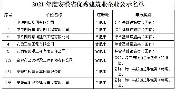 近日,安徽省住房和城乡建设厅发布了关于“2021年度安徽省优秀建筑业企业”认定名单,合肥路桥蝉联该项殊荣。