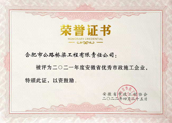 合肥路桥获评安徽省优秀市政施工企业