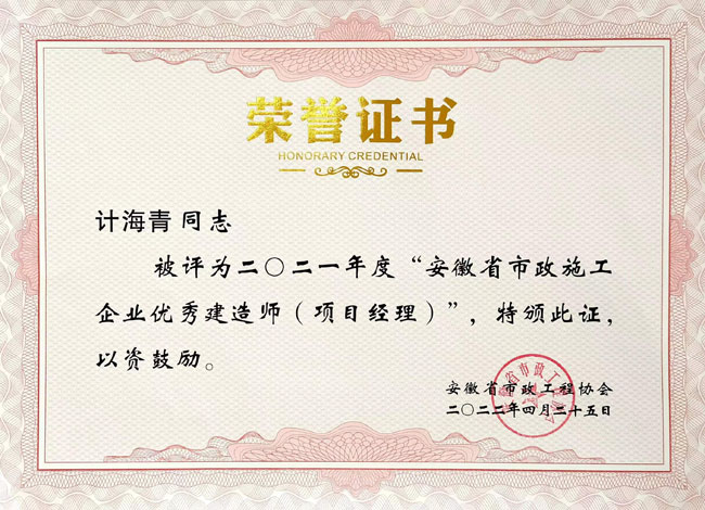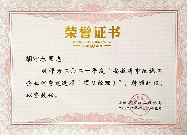 近日,从安徽省市政工程协会获悉,合肥路桥被评为“2021年度安徽省优秀市政施工企业”,胡守志同志、计海青同志被评为“2021年度安徽省市政施工企业优秀建造师(项目经理)” 。