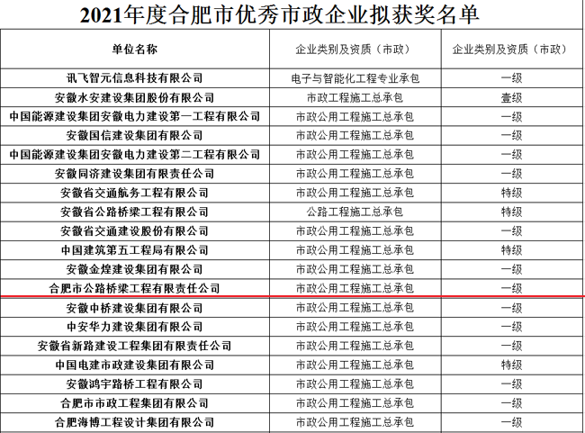 合肥市市政工程协会组织开展的2021年度合肥市优秀市政企业、优秀市政工程项目经理的评选工作,近日评选结果已公布。合肥路桥获评“2021年度合肥市优秀市政企业”,公司员工杜连峰、叶翔、余晓耀三位同志荣获“2021年度合肥市优秀市政项目经理”称号。
