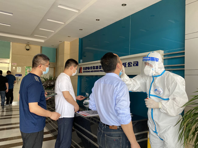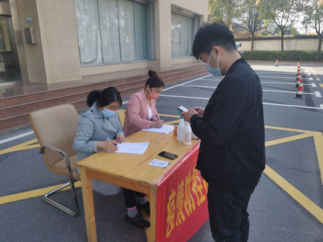 合肥路桥面对新一轮疫情风险,提前储备口罩、酒精、消毒液等物资。每天安排2名值班人员早上7点半开始,对公司职员进行体温测量、扫安康码、行程码登记记录,并对安康码黄码、红码以及高风险外来人员进行有效隔离。