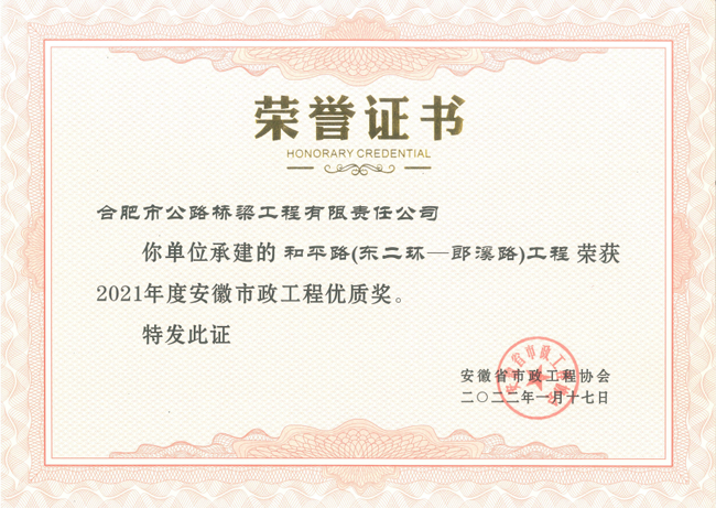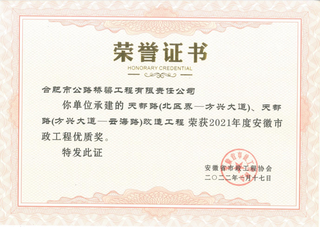近日,安徽省市政工程协会公布了荣获“2021年度安徽省市政工程优质奖”的获奖项目名单,由合肥路桥承建的天都路改造工程与和平路工程获此殊荣。