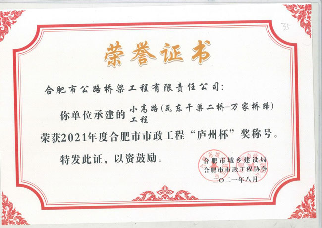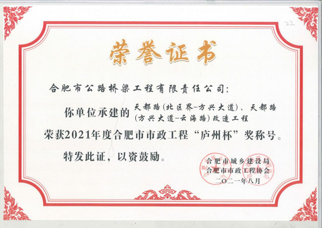 为促进市政工程质量进一步提高,鼓励各企业加强科学管理,严格施工过程质量控制,发挥示范引领作用,争创精品工程,日前,合肥市城乡建设局、合肥市市政工程协会就2021年度合肥市市政优质工程进行了通报表彰。其中,由合肥路桥承建的天都路改造工程、小高路工程荣获2021年度合肥市市政工程“庐州杯”奖。