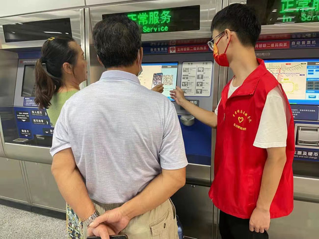 本次活动地点是四牌楼地铁站,这里位于合肥繁华商业地段,周边商业林立,上下班高峰期人流量巨大。合肥路桥的志愿者联合庐阳区雏鹰志愿服务队引导乘客正确的乘坐地铁。志愿者们分工明确,从指导乘客扫安康码、行程码、测温、安检到站厅内购票、进站、文明候车等一系列动作规范、主动并且热情,不仅维持了地铁站良好的乘车秩序,也缓解了地铁工作人员的工作压力。
