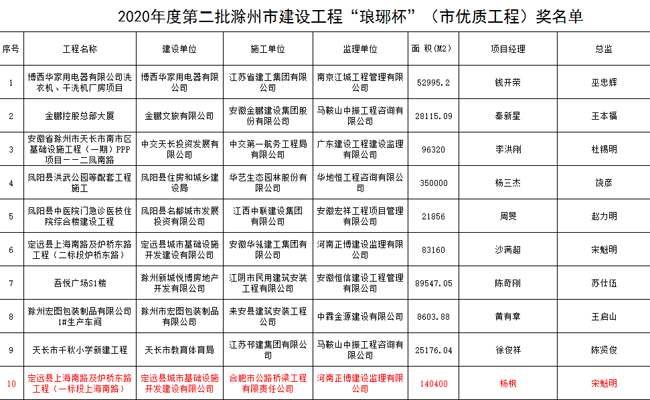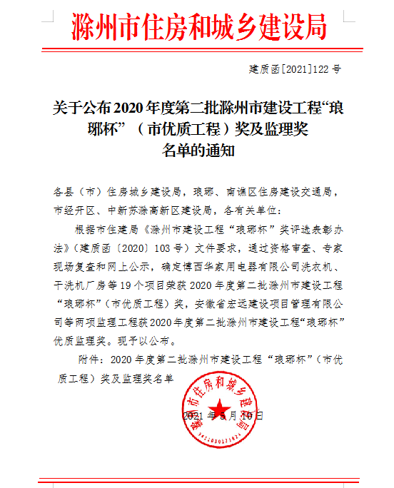 近日,从滁州市住房和城乡建设局网站获悉,滁州市建设工程“琅琊杯”奖评选结果已公示,由合肥路桥承建的定远县上海南路及炉桥东路工程(一标段上海南路)荣获2020年度第二批建设工程“琅琊杯”(市优质工程)奖。