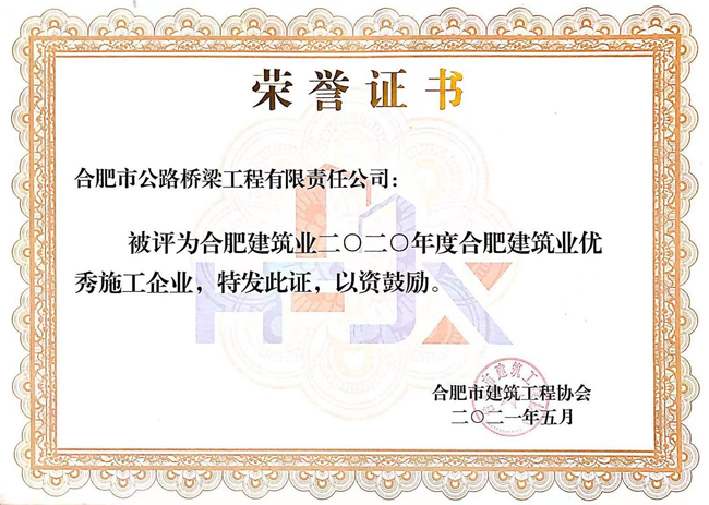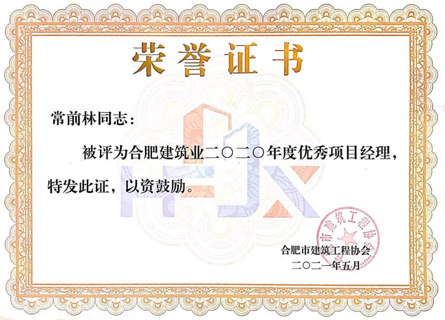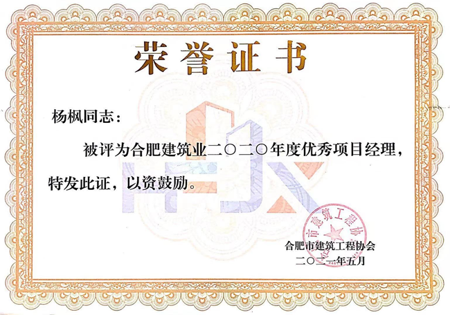 此荣誉证书主要是表彰企业2020年度在经营管理指标先进,企业年度总产值、产值利润率、工程质量和安全文明在行业均处于领先地位。此外,杨枫、常前林两位同志被评为合肥建筑业2020年度优秀项目经理。(叶凡)