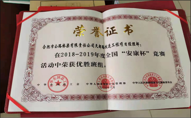 近日,中华全国总工会、应急管理部、国家卫生健康委员会联合发文,表彰2018―2019年度全国“安康杯”竞赛优胜集体、优胜班组和优秀个人,天都路改造工程项目经理部荣获优胜班组荣誉称号。