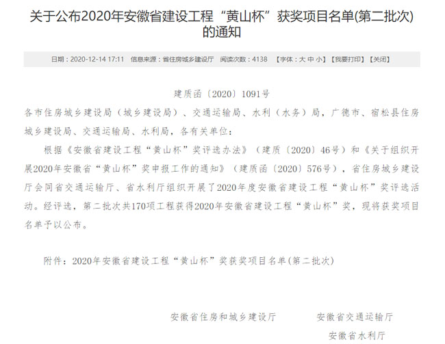 近日,从安徽省住房和城乡建设厅获悉,由省住房城乡建设厅会同省交通运输厅、省水利厅组织开展的2020年度安徽省建设工程“黄山杯”奖评选活动中由合肥路桥承建的“九龙路(繁华大道-方兴大道)等道路改造绿化、景观及立面整治工程一标段”工程和“环巢湖连接线栏杆集镇至环湖大道工程(S215栏滨路)”工程获得了“黄山杯”奖。(叶凡、何小兵)