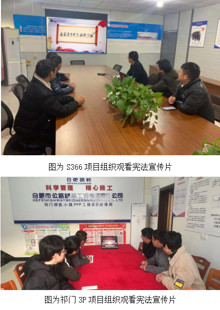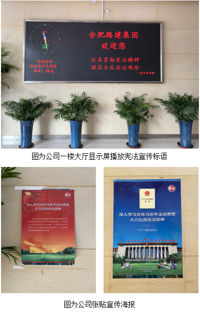 根据上级要求,结合工作实际和新冠肺炎疫情防控情况,在“宪法宣传周”期间,合肥路桥采取多种宣传方式,在公司张贴宣传海报营造浓厚法治氛围,并在一楼大厅电子显示屏播放宪法宣传标语。各分公司项目部组织职工学习宪法内容,并组织观看宪法宣传视频,深刻领会宪法精神实质,要将尊法学法守法用法思想牢记于心,并带领项目部成员开展尊崇宪法、学习宪法、遵守宪法、维护宪法、运用宪法的宣传教育活动。在现场施工过程中,将法治思想运用其中,严格遵守法律法规,确保施工安全进行。