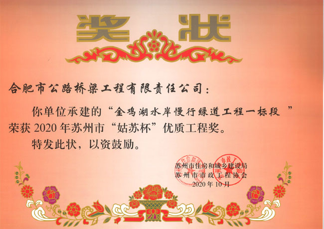 近日,在苏州市住建局发布的关于2020年度苏州市“姑苏杯”优质工程奖(市政等类)获奖项目名单中,由合肥路桥承建的苏州金鸡湖水岸慢行绿道工程一标段工程通过评审,获得苏州市“姑苏杯”优质工程奖。