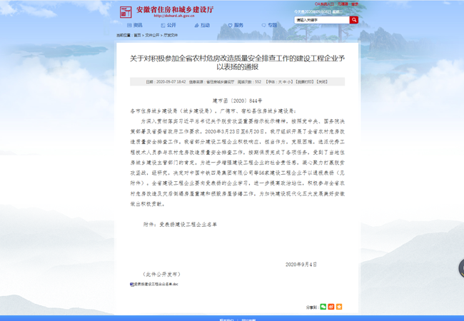 合肥路桥积极响应省住建厅组织开展的农村危房改造质量安全排查工作,认真履行社会责任和政治责任,选派以孙巍和解阳光带队的专家小组,在对马鞍山市和县和当涂县进行了为期10天农村危房改造“回头看”工作中,出色的完成扶贫攻坚任务,受到了当地住房城乡建设主管部门的肯定和民众的一致好评。9月4日,合肥路桥在安徽省住房和城乡建设厅关于对积极参加全省农村危房改造质量安全排查工作的建设工程企业受到通报表彰。