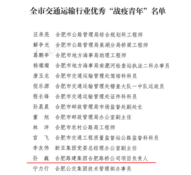6月2日,在市交通运输局党组发布的30名全市交通运输行业优秀“战疫青年”名单中,合肥路桥孙巍同志获“战疫青年”荣誉称号。