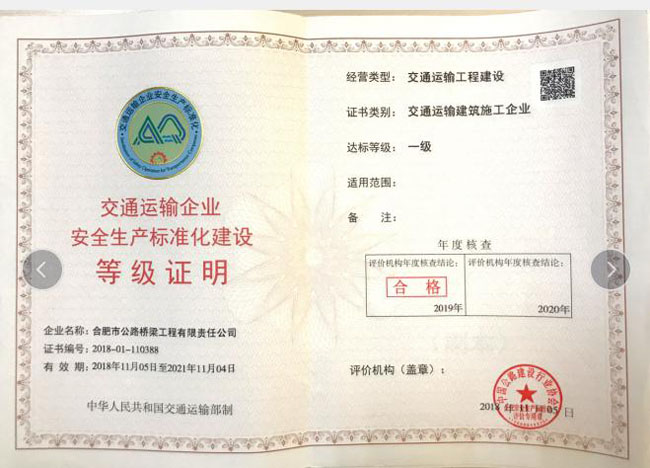 近日,经过中国公路建设行业协会评审,合肥路桥顺利通过交通部“交通运输企业安全生产标准化建设一级企业”复审,此次通过复审是对公司在安全生产管理、标准化建设方面做出的努力的最好的肯定。