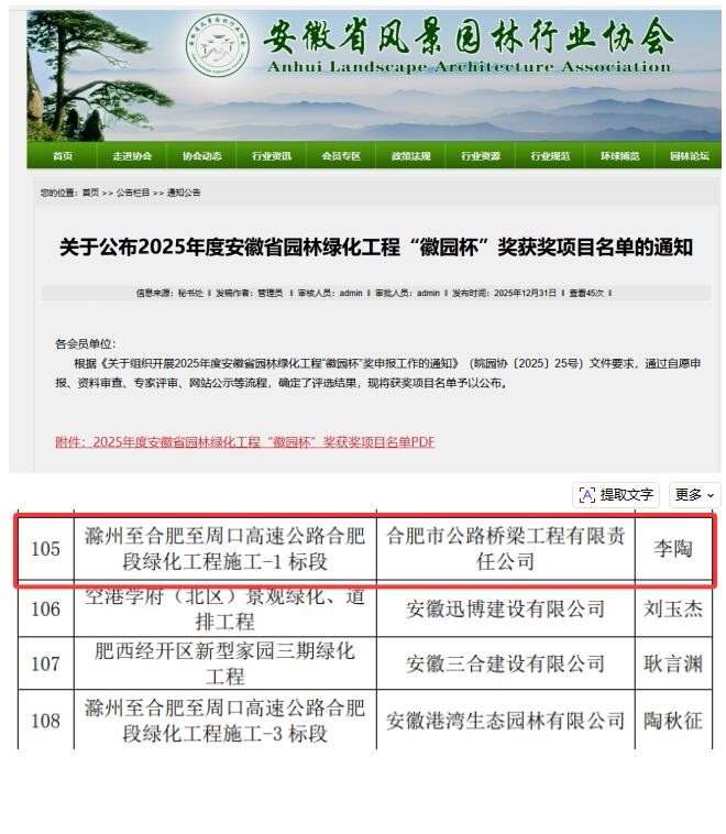 岁末将至,捷报频传!合肥路桥凭借深耕行业的坚守与精益求精的追求,斩获“安徽省市政施工企业AAA级信用企业”称号,承建的滁合周高速合肥段绿化工程施工1标段荣膺安徽省园林绿化优质工程“徽园杯”奖,以双项硕果为新年献礼。