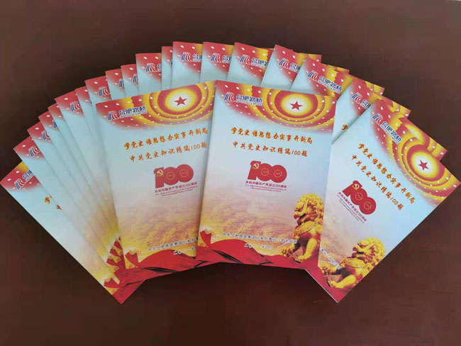 为进一步推动党史学习教育,创设有效载体。近日,合肥路桥党支部广泛搜集资料,精心编印了《学党史悟思想办实事开新局中共党史知识精编100题》,制作成“口袋书”发放至各基层党员手中,做到人手一册。