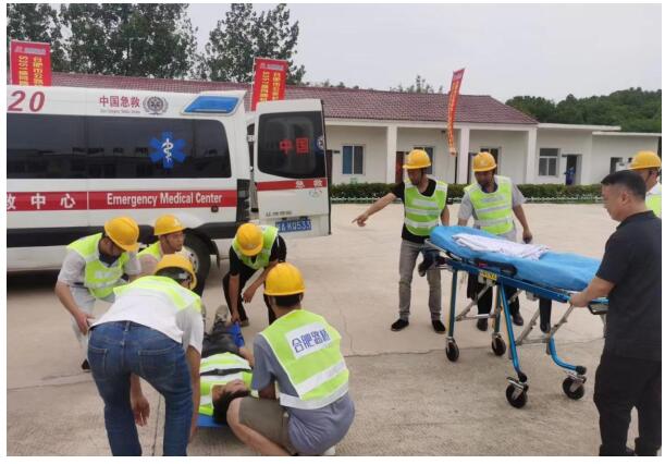 演练现场模拟一处挡土墙施工现场一名施工人员被正在作业的装载机碰倒,围绕设定场景项目部展开应急急救援演练。演练准备充分,现场有条不紊,活动取得实效,演练总指挥方建和执法大队张俊生对该项应急演练进行了点评和总结,对演练成效进行了肯定。