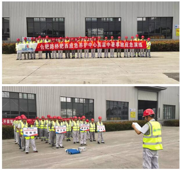 为积极开展第22个“安全生产月”活动,扎实有效地做好安全生产及项目施工,近日,合肥路桥应急养护中心在严店基地拌合站开展了高温中暑事故应急救援演练,公司安全管理部负责人田雷到场指导。