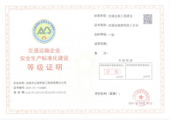 近日,经过中国公路建设行业协会评审,合肥路桥顺利通过交通部“交通运输企业安全生产标准化建设一级企业”复审。