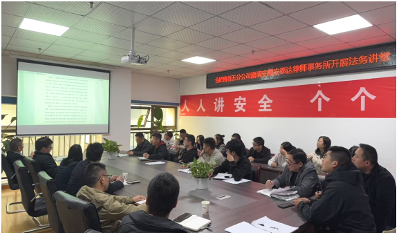 在所属合肥轨道交通4标段项目部会议室,安泰达律师事务所许竞文律师就施工企业施工过程中遇到的合同风险、工程质量风险、施工安全风险、劳动纠纷风险进行了讲解。随后还通过典型案例分析,深入浅出地讲解施工企业法律风险的具体表现及解决办法,进一步深化学习成效。