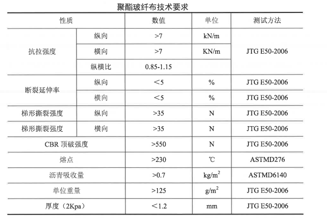 聚酯玻纤布的技术质量要求(具体详见报价资料合同):聚酯玻纤布是由聚酯纤维和玻璃纤维合成的无纺合成材料,供货单位必须提交出厂检验报告及进口商检报告,质量标准见如下表: